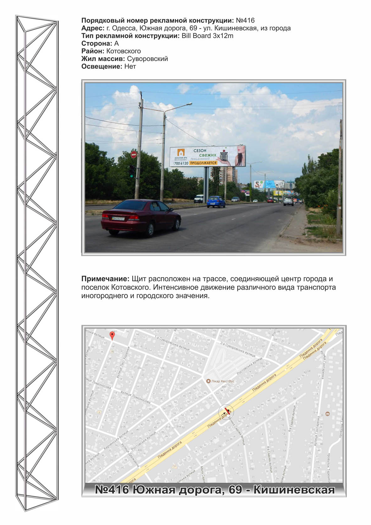 Щит расположен на трассе, соединяющей центр города и поселок Котовского. Интенсивное движение различного вида транспорта иногороднего и городского значения. |