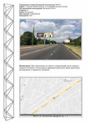 Щит расположен на трассе, соединяющей центр города и поселок Котовского. Интенсивное движение различного вида транспорта иногороднего и городского значения. |