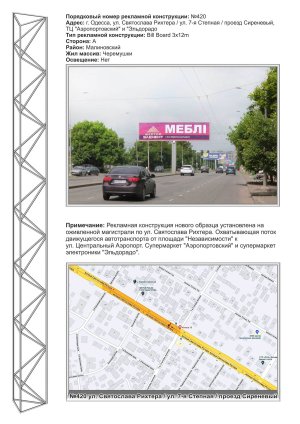 Рекламная конструкция нового образца установлена на оживленной магистрали по ул. Святослава Рихтера. Охватывающая поток движущегося автотранспорта от площади "Независимости" к ул. Центральный Аэропорт. Супермаркет "Аэропортовский" и супермаркет электроники "Эльдорадо". |