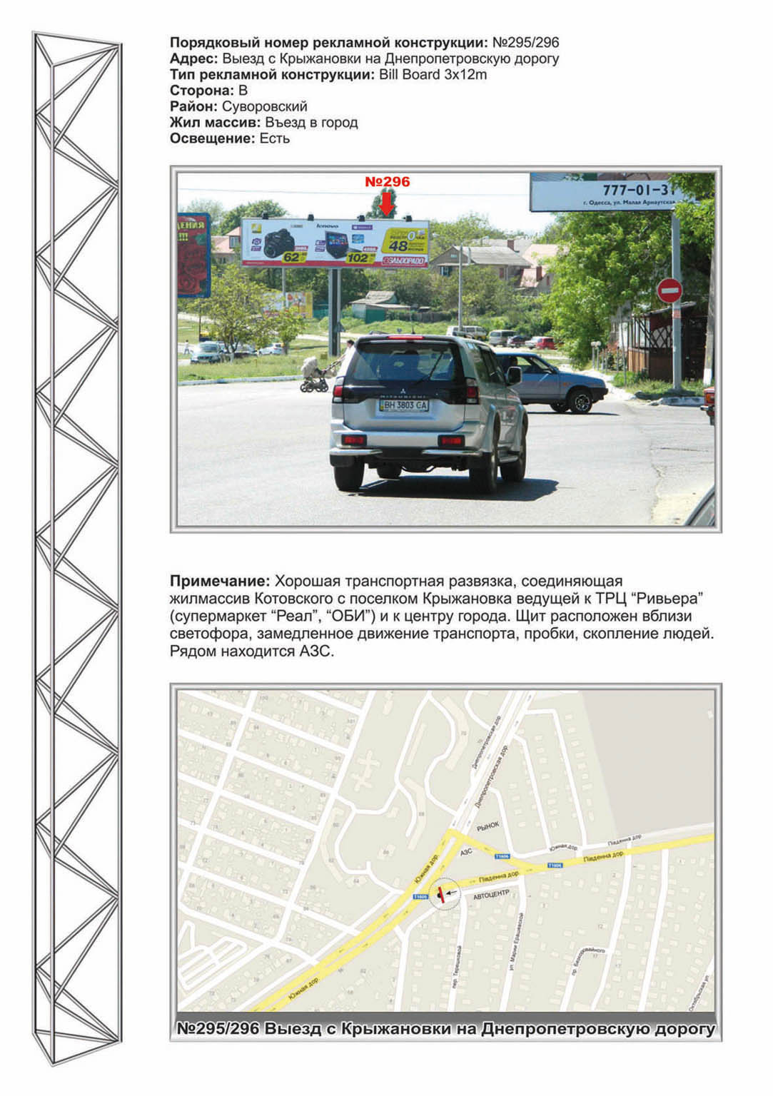 Хорошая транспортная развязка, соединяющая жилмассив Котовского с поселком Крыжановка ведущей к ТРЦ "Ривьера" (супермаркет "Реал", "ОБИ") и к центру города. Щит расположен вблизи светофора, замедленное движение транспора, пробки, скопление людей. Рядом находится АЗС. |