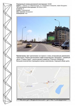 Щит расположен на трассе с очень интенсивным движением транспорта. Рядом расположено кафе-кондитерская “Штрудель”, семейный центр “Страна чудес”, школа раннего развития “Premium residence”, большое количество строящихся жилых комплексов. Хороший обзор щита. |