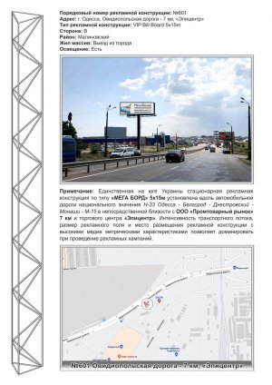 Единственная на юге Украины стационарная рекламная конструкция по типу «МЕГА БОРД» 5х15м установлена вдоль автомобильной дороги национального значения Н-33 Одесса - Белгород - Днестровский - Монаши - М-15 в непосредственной близости с ООО «Промтоварный рынок» 7 км и торгового центра «Эпицентр». Интенсивность транспортного потока, размер рекламного поля и место размещения рекламной конструкции с