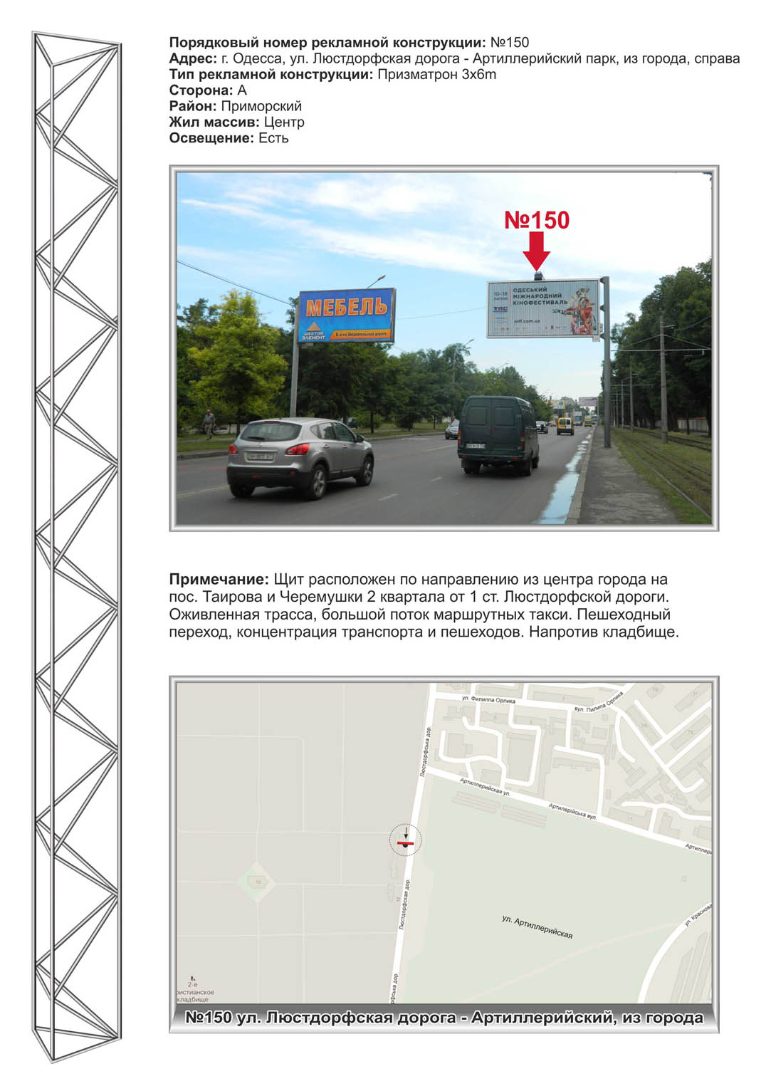пос. Таирова и Черемушки 2 квартала от 1 ст. Люстдорфской дороги. Оживленная трасса, большой поток маршрутных такси. Пешеходный переход, концентрация транспорта и пешеходов. Напротив кладбище. |