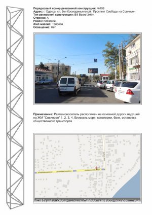 | Рекламоноситель расположен на основной дороги ведущей на ЖМ "Совиньон" 1,2,3,4. Близость моря, санатории, банк, остановка общественного транспорта