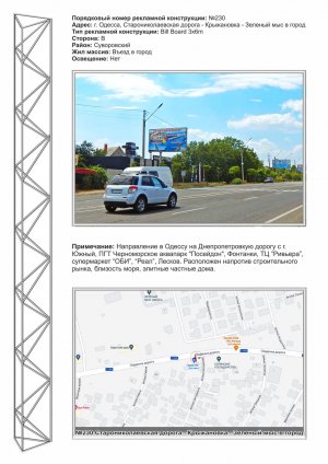 | Направление в Одессу на Днепропетровкую дорогу с г. Южный, ПГТ Черноморское аквапарк "Посейдон", Фонтанки, ТЦ "Ривьера", супермаркет "ОБИ", "Реал", Лесков. Расположен напротив строительного рынка, близость моря, элитные частные дома. |