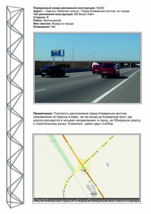 | Плоскость расположена перед Клеверным мостом, направление из Одессы в Киев, так же въезд на Клеверный мост, где дорога расхотися в четырех направлениях: в город, на Объездную дорогу, к строительному рынку "Анжелика", район двух столбов. |