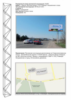 | Рекламная конструкция расположена на Старониколаевском шоссе - Автомобильная дорога Т-16-06 Одесса – Южный. Возле поворота на ЖК «Золотые ключи». Выезд с гипермаркета "ОБИ" и ТРЦ "Ривьера" Направление в город. Интенсивное движение. |