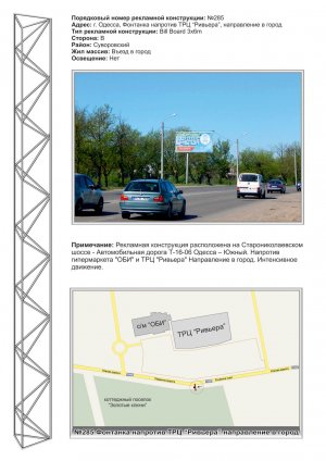 | Рекламная конструкция расположена на Старониколаевском шоссе - Автомобильная дорога Т-16-06 Одесса – Южный. Напротив гипермаркета "ОБИ" и ТРЦ "Ривьера" Направление в город. Интенсивное движение. |
