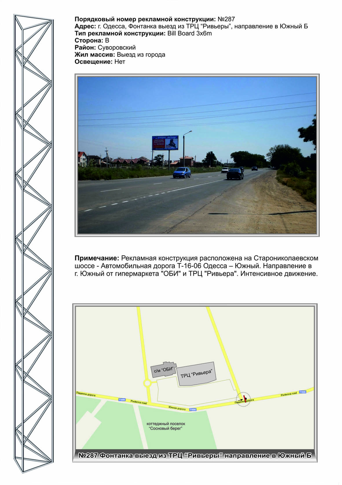 | Рекламная конструкция расположена на Старониколаевском шоссе - Автомобильная дорога Т-16-06 Одесса – Южный. Направление в г. Южный от гипермаркета "ОБИ" и ТРЦ "Ривьера". Интенсивное движение. |