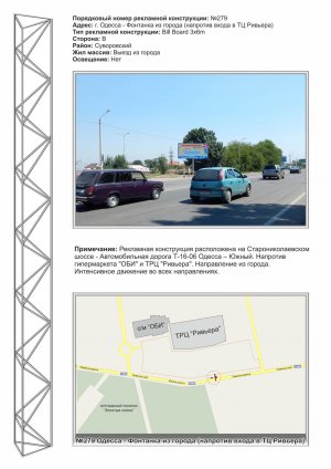 | Рекламная конструкция расположена на Старониколаевском шоссе - Автомобильная дорога Т-16-06 Одесса – Южный. Напротив гипермаркета "ОБИ" и ТРЦ "Ривьера". Направление из города. Интенсивное движение во всех направлениях.
