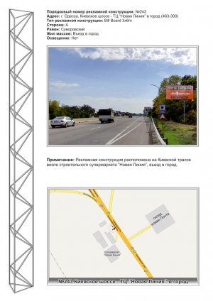 | Рекламная конструкция расположена на Киевской трассе возле строительного супермаркета "Новая Линия", въезд в город. |