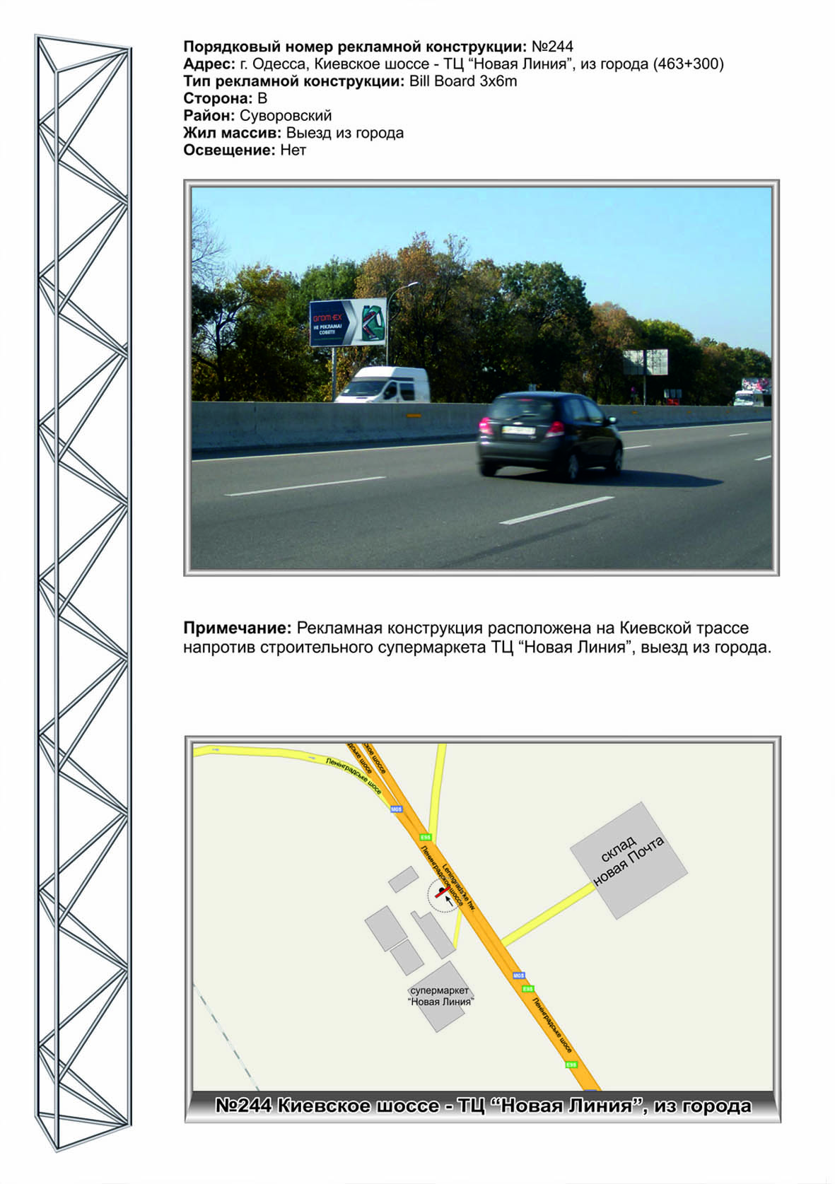 | Рекламная конструкция расположена на Киевской трассе напротив строительного супермаркета ТЦ "Новая Линия", выезд из города. |