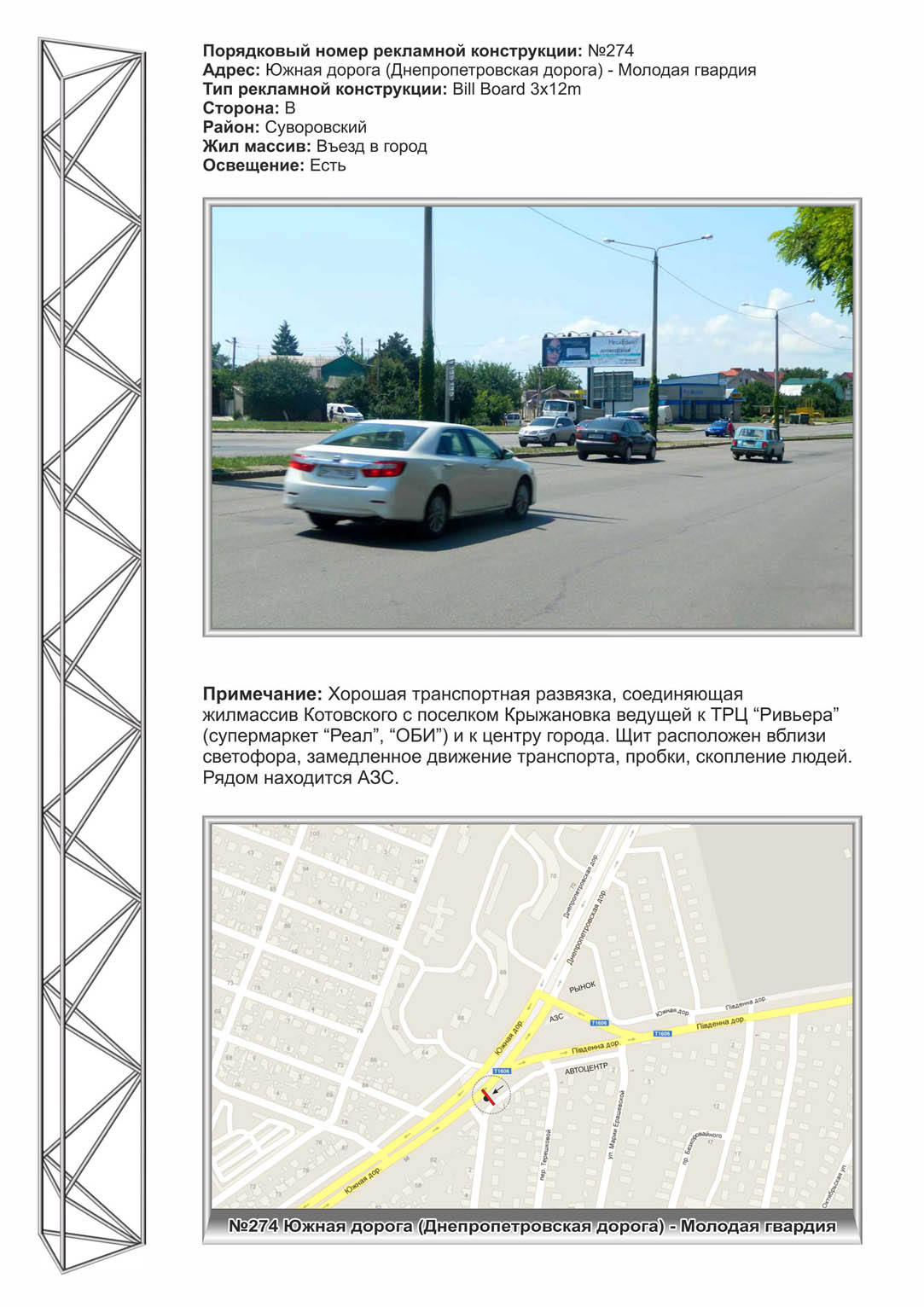 | Хорошая транспортная развязка, соединяющая жилмассив Котовского с поселком Крыжановка ведущей к ТРЦ "Ривьера" (супермаркет "Реал", "ОБИ") и к центру города. Щит расположен вблизи светофора, замедленное движение транспора, пробки, скопление людей. Рядом находится АЗС. |