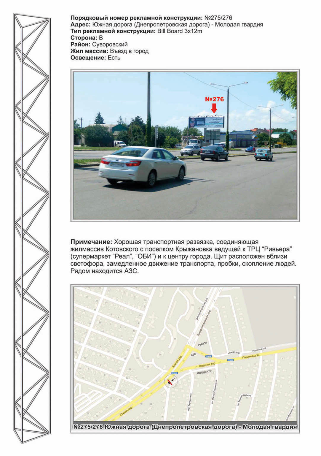 | Хорошая транспортная развязка, соединяющая жилмассив Котовского с поселком Крыжановка ведущей к ТРЦ "Ривьера" (супермаркет "Реал", "ОБИ") и к центру города. Щит расположен вблизи светофора, замедленное движения транспора, пробки, скопление людей. Рядом находится АЗС. |