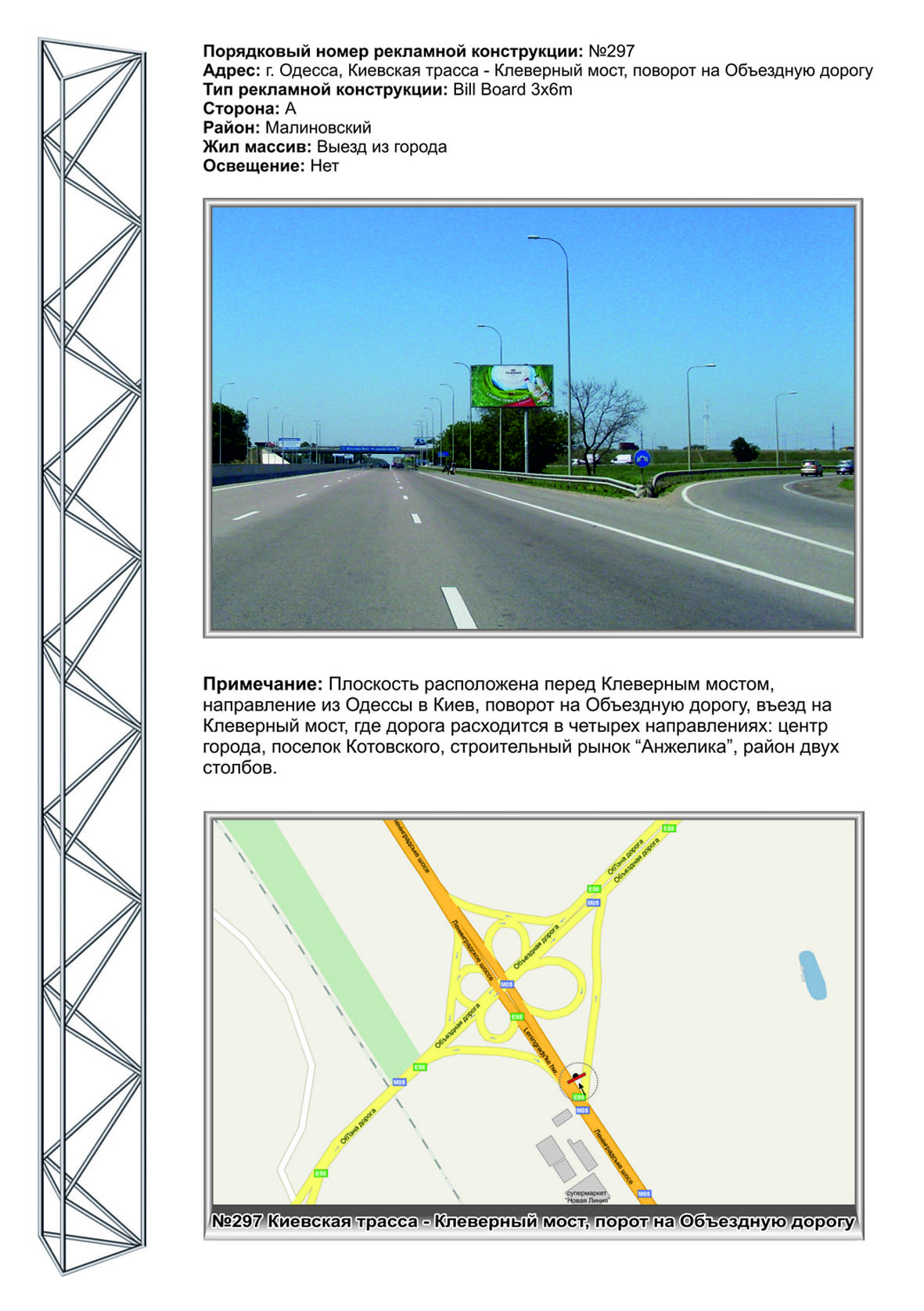 направление из Одессы в Киев, поворот на Объездную дорогу, въезд на Клеверный мост, где дорога расходится в четырех направлениях: центр города, поселок Котовского, строительный рынок “Анжелика”, район двух столбов. |