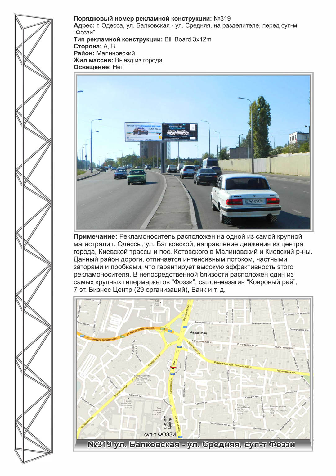 | Рекламоноситель расположен на одной из самой крупной магистрали г. Одессы, ул. Балковской, направление движения из центра города, Киевской трассы и пос. Котовского в Малиновский и Киевский р-ны. Данный район дороги, отличается интенсивным потоком, частными заторами и пробками, что гарантирует высокую эффективность этого рекламоносителя. В непосредственной близости расположен один из самых крупных гипермаркетов “Фоззи”, салон-мазагин “Ковровый рай”, 7 эт. Бизнес Центр (29 организаций), Банк и т. д. |