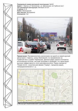 | Рекламоноситель расположен на одной из самой крупной магистрали г. Одессы, улицы Балковской, по направлению на Горбатый мост, в р-н Черемушек. Данный район дороги отличается интенсивным потоком, частыми заторами и пробками, что гарантирует высокую эффективность этого рекламоносителя. Рядом находится “Новая почта”, строительная фирма “Сервус”, городское радио,