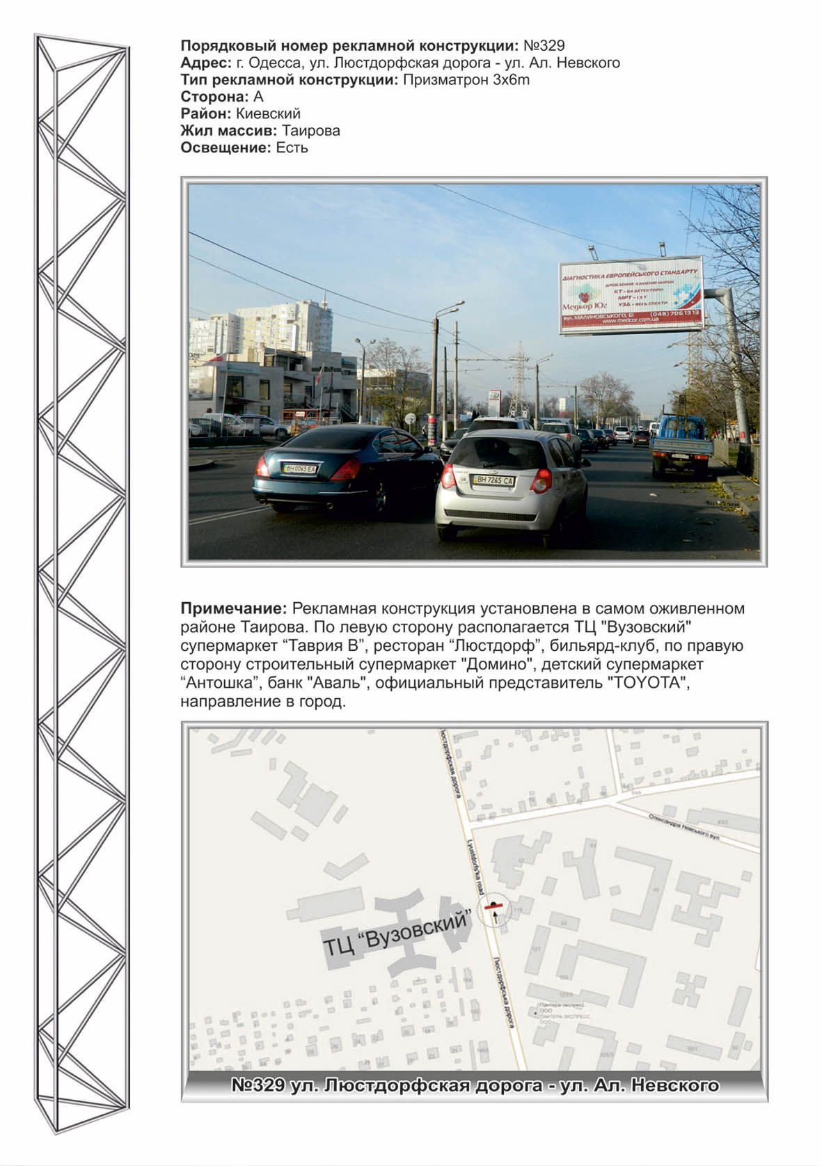 | Рекламная конструкция установлена в самом оживленном районе Таирова. По левую сторону располагается ТЦ "Вузовский" супермаркет “Таврия В”, ресторан “Люстдорф”, бильярд-клуб, по правую сторону строительный супермаркет "Домино", детский супермаркет “Антошка”, банк "Аваль", официальный представитель "TOYOTA", направление в город. |