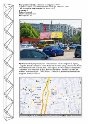 | Щит расположен в крупнейшем спальном районе города, Таирова. Рядом находится суп-т “Копейка”, бизнес-центр, химчистка “Кимс”, стоматологическая клиника, AWV-Автосервис, SV-Avto салон автопроката, “Кровлан” строительная фирма, мебельный салон, торгово-монтажная фирма “Теплостандарт”. Остановочный комплекс, постоянное скопление людей и автотранспорта. |