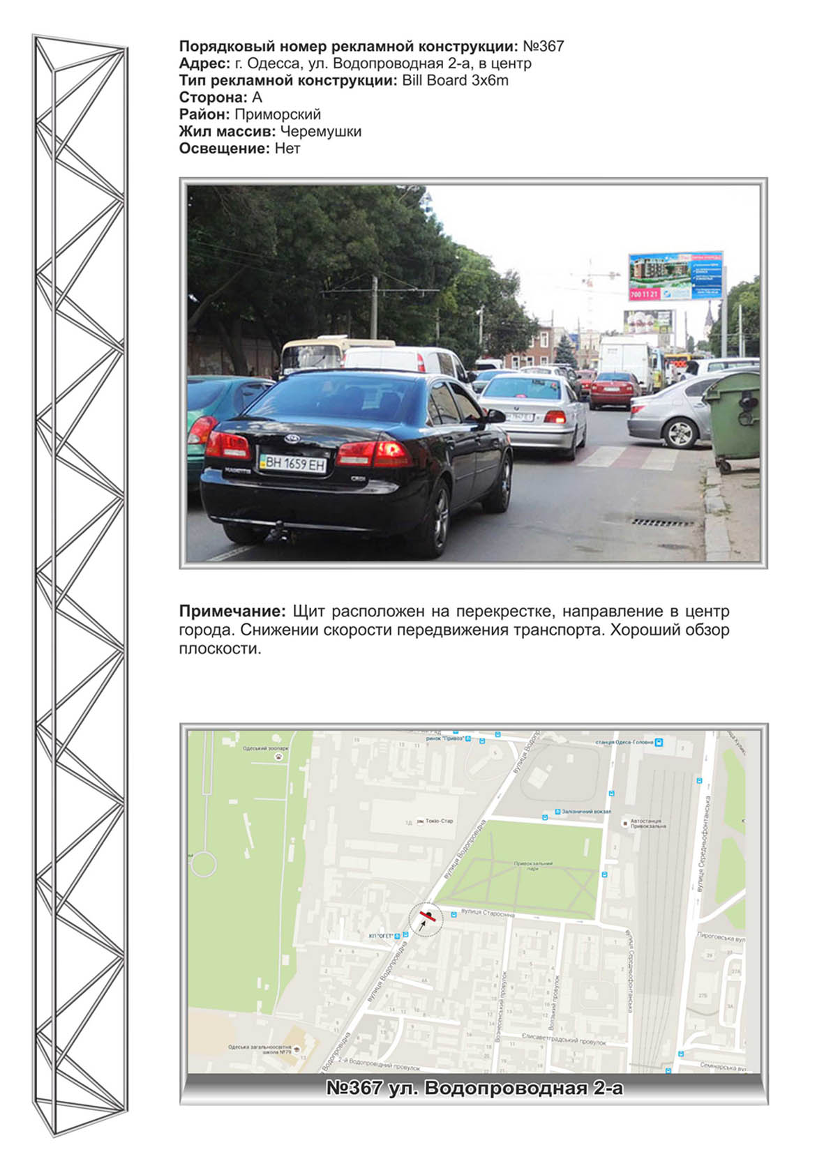 | Щит расположен на перекрестке, направление в центр города. Снижении скорости передвижения транспорта. Хороший обзор плоскости. |