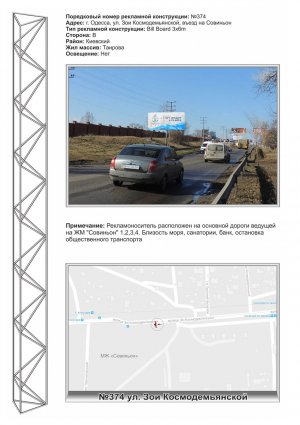 | Рекламоноситель расположен на основной дороги ведущей на ЖМ "Совиньон" 1,2,3,4. Близость моря, санатории, банк, остановка общественного транспорта |