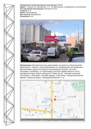 | Рекламоноситель расположен на одной из самой крупной магистрали г. Одессы, улицы Балковской, по направлению на автовокзал. Данный район дороги отличается интенсивным потоком, частыми