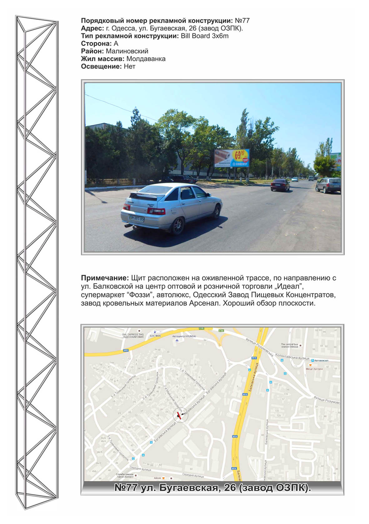 | Щит расположен на оживленной трассе, по направлению с ул. Балковской на центр оптовой и розничной торговли „Идеал”, супермаркет "Фоззи", автолюкс, Одесский Завод Пищевых Консервантов, завод кровельных материалов Арсенал. Хороший обзор плоскости. |