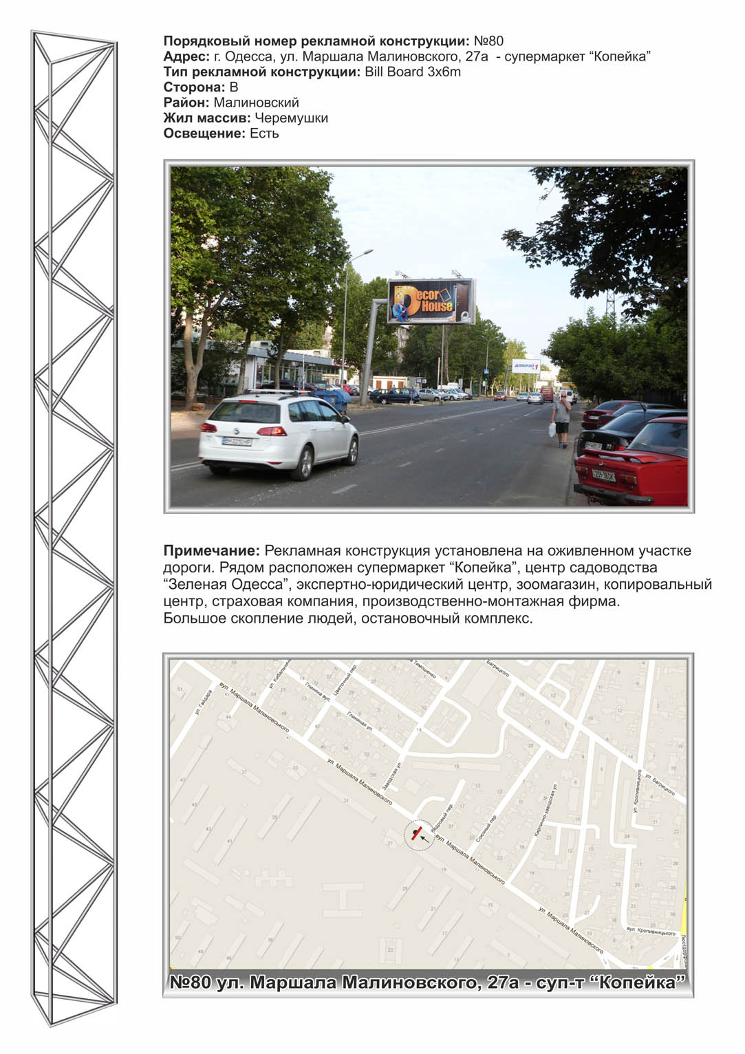 | Рекламная конструкция установлена на оживленном участке дороги. Рядом расположен супермаркет “Копейка”, центр садоводства “Зеленая Одесса”, экспертно-юридический центр, зоомагазин, копировальный центр, страховая компания, производственно-монтажная фирма. Большое скопление людей, остановочный комплекс. |