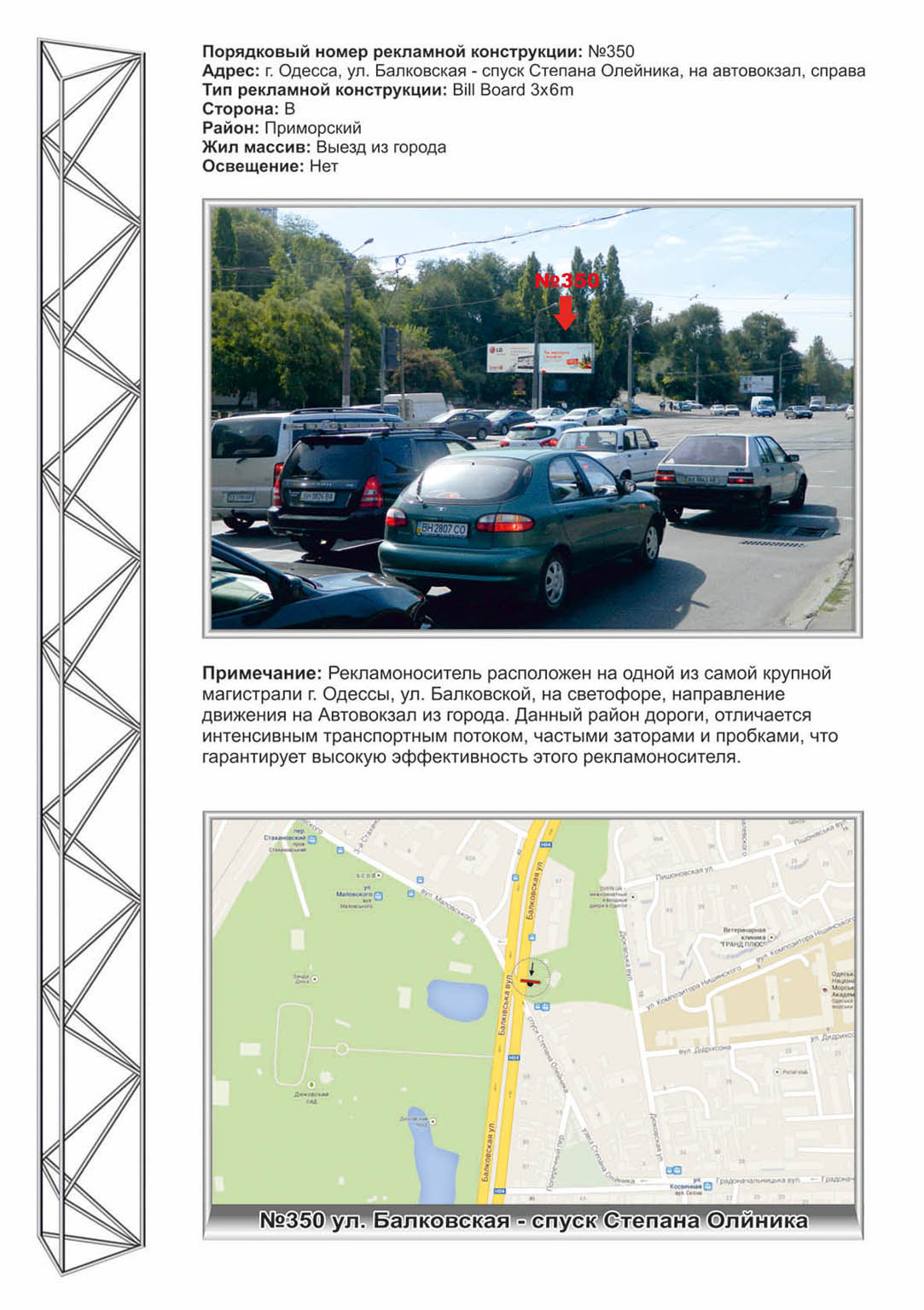 | Рекламоноситель расположен на одной из самой крупной магистрали г. Одессы, ул. Балковской, на светофоре, направление движения на Автовокзал из города. Данный район дороги, отличается интенсивным транспортным потоком, частыми заторами и пробками, что гарантирует высокую эффективность этого рекламоносителя. |