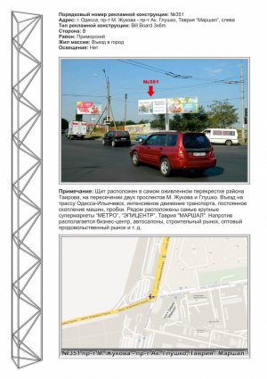 | Щит расположен в самом оживленном перекрестке района Таирова, на пересечении двух проспектов М. Жукова и Глушко. Въезд на трассу Одесса-Ильичевск, интенсивное движение транспорта, постоянное скопление машин, пробки. Рядом расположены самые крупные супермаркеты “МЕТРО”, “ЭПИЦЕНТР”, Таврия "МАРШАЛ". Напротив