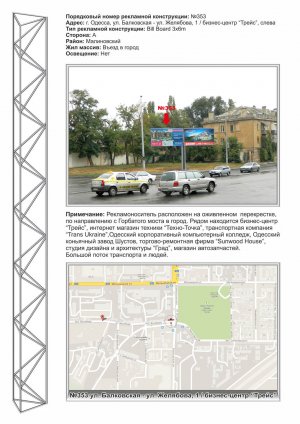 | Рекламоноситель расположен на оживленном перекрестке, по направлению с Горбатого моста в город. Рядом находится бизнес-центр “Трейс”, интернет магазин техники “Техно-Точка”, транспортная компания “Trans Ukraine”,Одесский корпоративный компьютерный колледж, Одесский