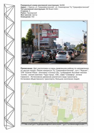 | Щит расположен в очень оживленном районе по направлению из центра города. Рядом находится ТЦ “Среднефонтанский”, суп-т “Фуршет”, ТРК “Платан Plaza”, кинотеатр «Cinima Citi», супермаркет бытовой техники “Comfy”, жилой комплекс “Чудо-город”, АЗС, кафе “Симафор”, аптека Гаевского . Интенсивное движение различного вида транспорта.