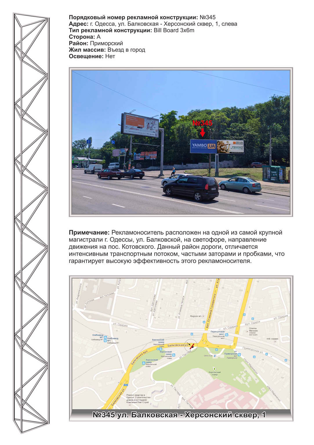 | Рекламоноситель расположен на одной из самой крупной магистрали г. Одессы, ул. Балковской, на светофоре, направление движения на пос. Котовского. Данный район дороги, отличается интенсивным транспортным потоком, частыми заторами и пробками, что гарантирует высокую эффективность этого рекламоносителя. |
